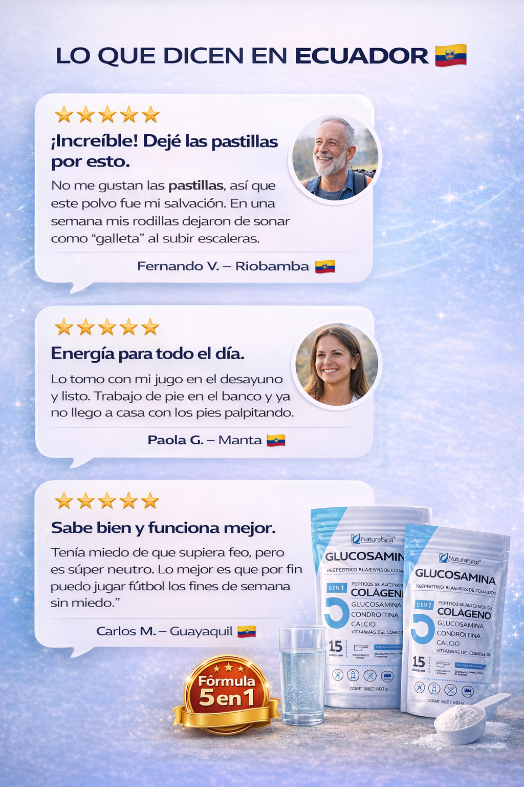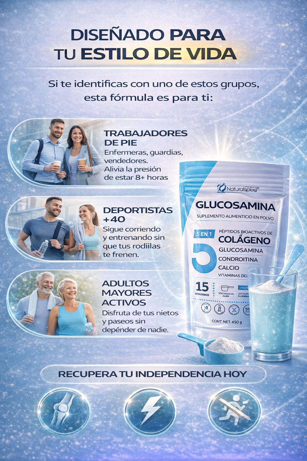"¡Pensé que tendría que dejar mi trabajo! 😭""Soy enfermera y paso 12 horas de pie. El dolor de rodillas era insoportable, ya no podía más. Una colega me recomendó esta Glucosamina y en solo pocos días el cambio fue increíble. Ya no siento esos 'pinchazos' al terminar mi turno. ¡Literalmente me devolvió la vida! Gracias."